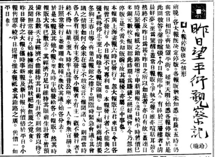 早晨的望平街除了聚集报贩,还有众多关心时事、热衷新闻的人。尤其当有重大事情发生时,报刊除正常出版外,各报馆为了提升新闻时效,争相发布“号外”,甚至对一些重要电讯常常抢先用大字抄出,文字简介,时效性强,有时还用红笔加圈加点,粘贴在报馆门口或窗户玻璃上,广受欢迎。很多关心时局的人不满足阅读正常发行的报刊,常常跑到望平街来打探消息。像当年辛亥革命期间,民众争相探听革命消息,望平街上,挤得人山人海、水泄不通,车马经过都必须绕道而行。中日战事吃紧时,望平街上也比往常更闹哄……